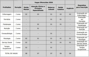 A Residência Integrada Multiprofissional em Saúde, áreas Materno Infantil, Urgência e Saúde Coletiva e os programas de Residência Multiprofissional em Atenção Clínica e Cirúrgica Especializada e em Saúde Mental oferecem, no total, 32 vagas para os profissionais graduados em Enfermagem, Farmácia, Fisioterapia, Nutrição, Fonoaudiologia, Psicologia, Serviço Social e Terapia Ocupacional.