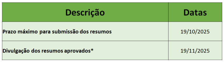 - A submissão de resumo(s) de trabalho(s) para seleção e posterior apresentação no evento será realizada somente por meio do documento (resumo) em PDF enviados ao final do preenchimento do formulário até dia 19/10/2025 às 23h59min (horário oficial de Brasília). Não serão aceitas outras formas de submissão.