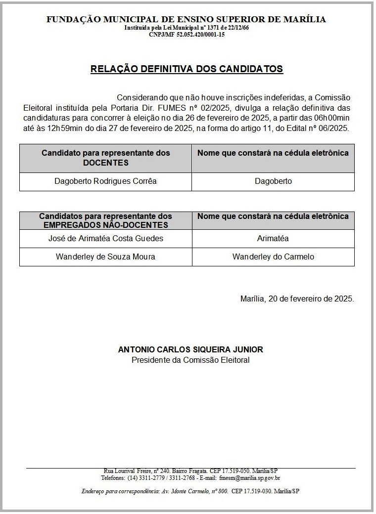 Considerando que não houve inscrições indeferidas, a Comissão Eleitoral instituída pela Portaria Dir. FUMES nº 02/2025, divulga a relação definitiva das candidaturas para concorrer à eleição no dia 26 de fevereiro de 2025, a partir das 06h00min até às 12h59min do dia 27 de fevereiro de 2025, na forma do artigo 11, do Edital nº 06/2025.